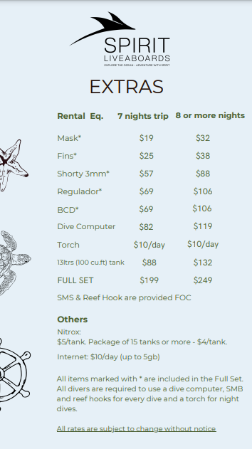 High-quality diving equipment is available for rent, ensuring you have everything you need for a comfortable and safe diving experience. Nitrox is also available for certified divers, enhancing safety and bottom time for those unforgettable underwater encounters. There is an additional charge for the hire of equipment and Nitrox. Cash is USD or EUR is accepted along with Visa, MaterCard, and American Express.